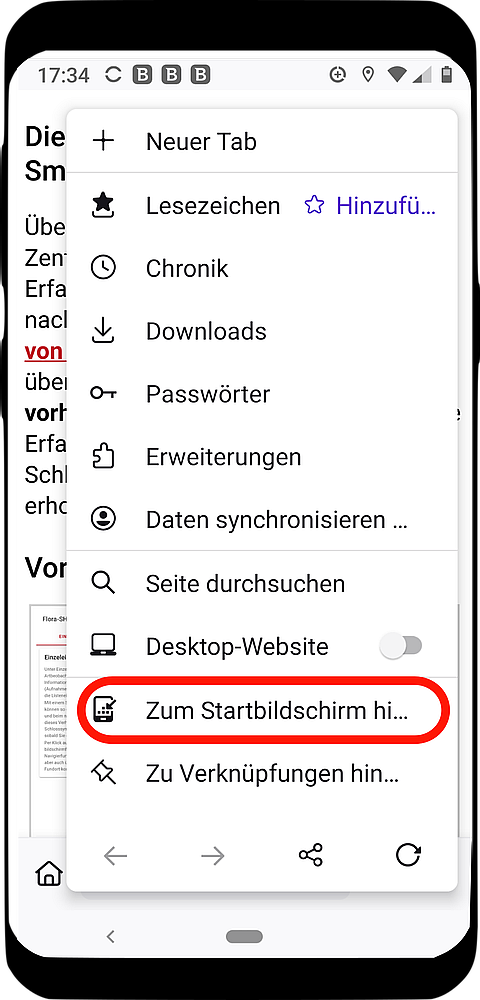Navigieren Sie zum Menüpunkt "Zum Startbildschirm hinzufügen". Abschließend müssen Sie noch das Hinzufügen bestätigen. Danach kann die App über den angelegten App-Button gestartet werden.